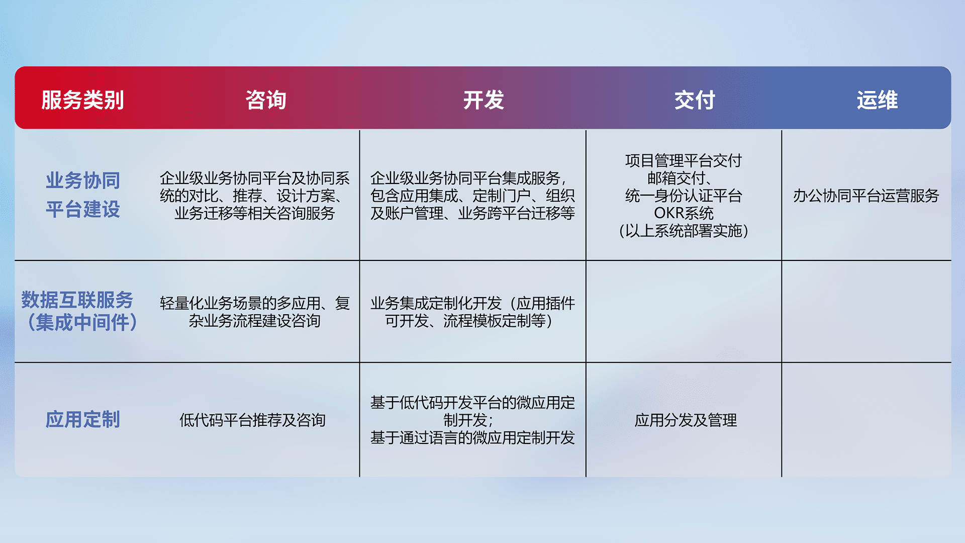 针对钉钉、、、、企微、、IDaas等平台级产品提供产品的规划、、、方案、、、交付、、定制化开发等服务,,实现如统一协同办公、、、、智能客户服务、、混合会议管理、、、、智能数据查询、、、等业务场景,,实现数字化转型。。。