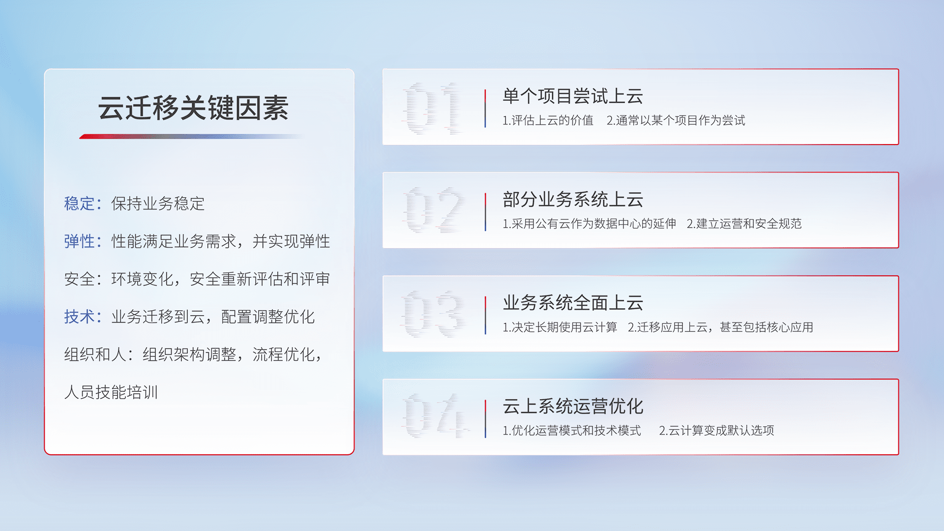 结合实际业务,,,从规划设计、、云平台选型、、云原生改造、、、数据迁移、、集成交付,,迁移全过程为客户识别最佳上云路径,,做好风险识别管理,,,设计网络架构、、、身份权限、、安全审计合规、、、操作审计、、、日志审计、、监控告警策略、、、多站点容灾设计等,,,,对云上基础设施进行整体规划,,,提升IT治理水平,,以满足弹性、、、、高可用、、、高性能的需求。。。