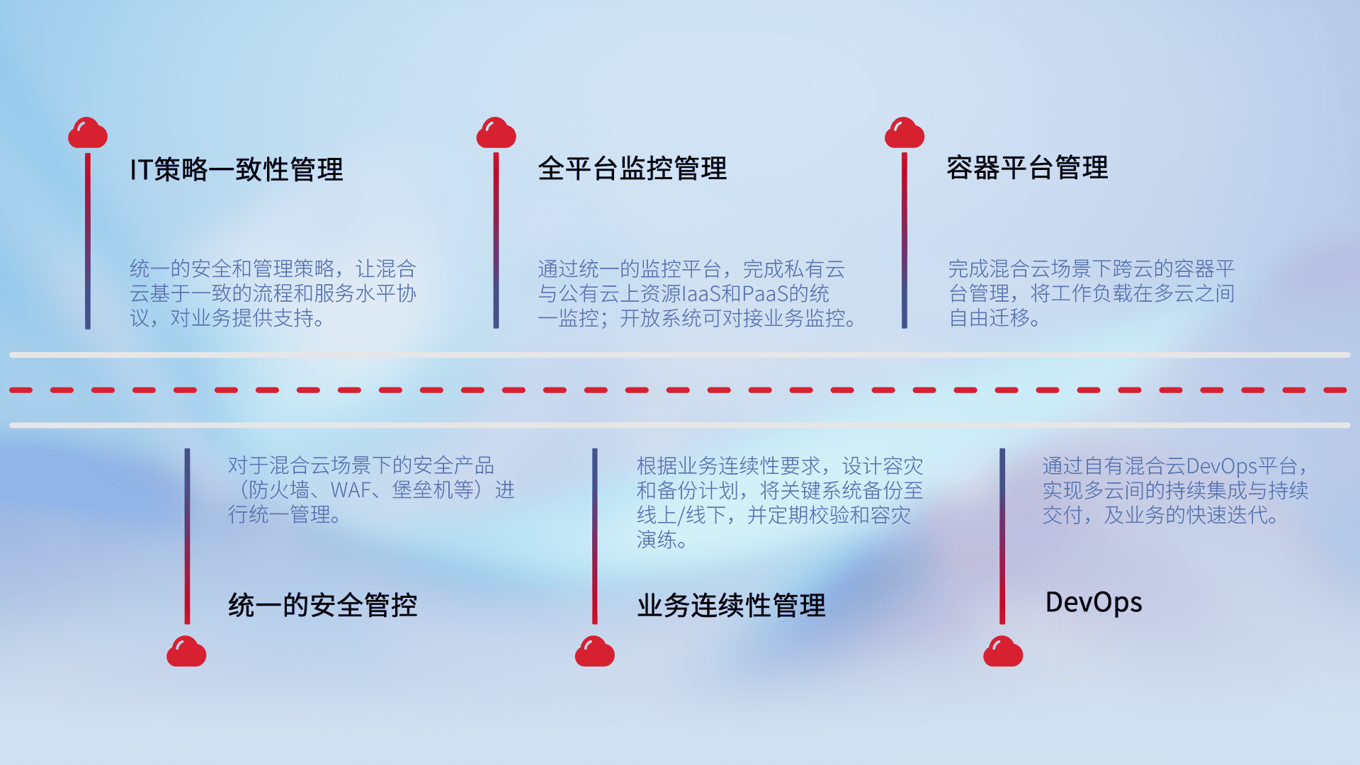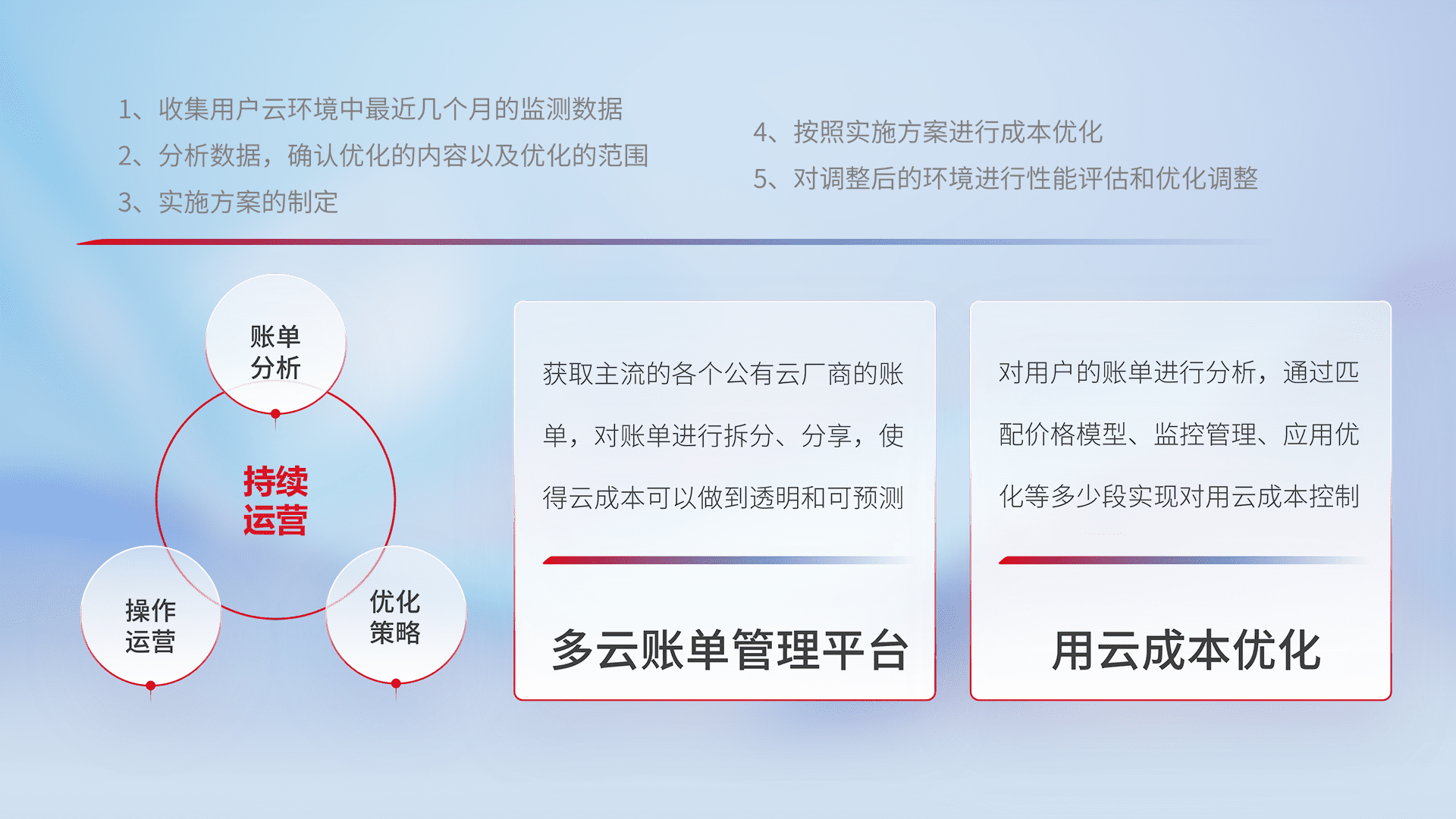 通过多云纳管,,,,以统一的资源数据模型把客户的云资源进行抽象和封装,,,,进而实现对多云资源的统一操作,,,保障云资源管理的可靠性、、、稳定性与可用性。。。量身定制化运维内容,,配置、、开发运维、、、、补丁管理、、、、备份、、监控、、、认证和访问管理、、审计和日常巡检等,,,,保障在用云过程中的可靠度,,,稳定度以及高可用率。。。
